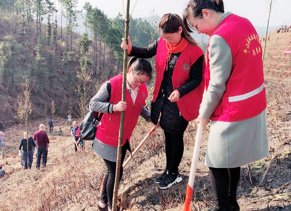 在植树现场,人头攒动,热闹非凡,志愿者们几个人一组,相互配合,齐心协力,一道挥锹铲土、培土踏实、合力栽下了一棵棵树苗。经过3个多小时的辛勤劳动,200余株紫薇、桂花、香樟、杜英便屹立于山间。