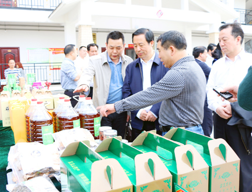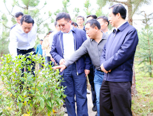 许达哲一行首站来到了平江县瓮江镇兰家洞农民林业专业合作社,详细了解平江通过林下经济产业发展,带动脱贫攻坚工作情况。在合作社办公楼前,许达哲一行饶有兴趣地参观了该社的林下经济产品展台,详细了解了各种林下产品的作用和销售情况。随后,许达哲一行还深入合作社的千亩黄栀子林下种植示范基地进行了观摩。