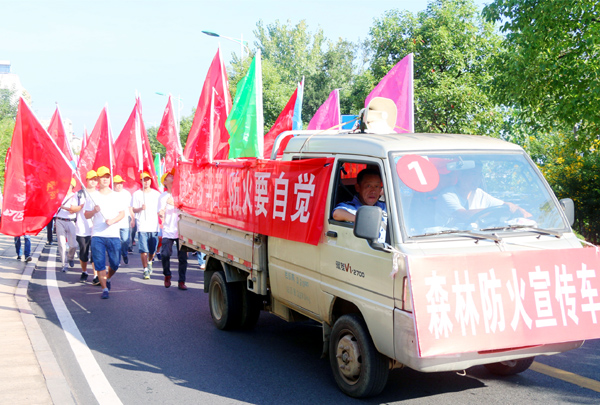 9月27日,在湖南平江县重点林业乡镇和重点林区,十几辆悬挂宣传标语的车辆,一队队手持彩旗、着装统一的志愿者,整齐有序地穿行在大街小巷,开展护林防火宣传。