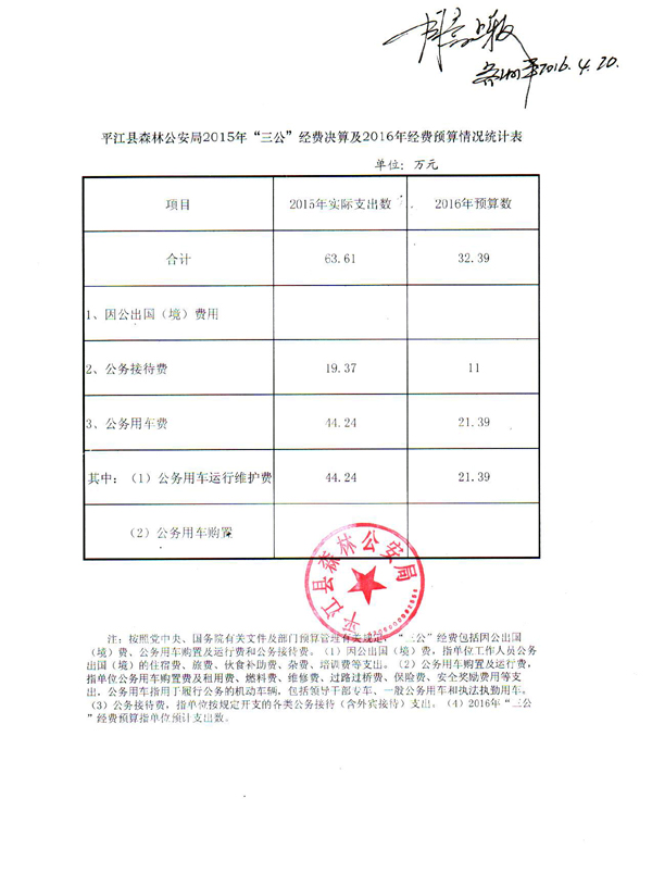 平江县森林公安局2015年“三公”经费决算及2016年经费预算情况统计表